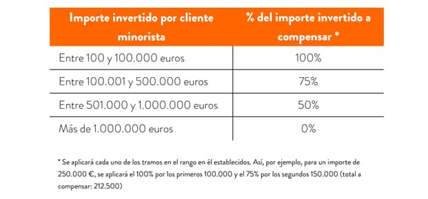Ejemplo: En una inversión de 2.000.000€ en acciones, en las fechas objeto de compensación y con los requisitos necesarios (mencionados anteriormente) para la misma, se compensará del siguiente modo: los primeros 100.000 € se retribuyen al 100%; el resto, hasta 500.000€, se reciben el 75% (quita del 25%); y el resto hasta 1.000.000€, un 50% (quita del 50%). El 1.000.000€ restante, hasta cubrir el total de la inversión, tiene una compensación del 0% (quita del 100 %).