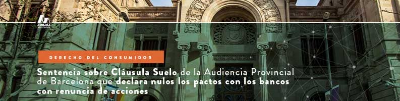 Desde finales de octubre de este año, la Audiencia Provincial de Barcelona ha cambiado el criterio que tenía sobre los acuerdos privados de cláusula suelo con renuncia de acciones legales acogiendo, por fin, la doctrina del Tribunal Supremo en este punto y declarando la nulidad de la cláusula de renuncia de acciones, lo que supone, por tanto, que se pueda reconocer la nulidad de la cláusula suelo inicial.